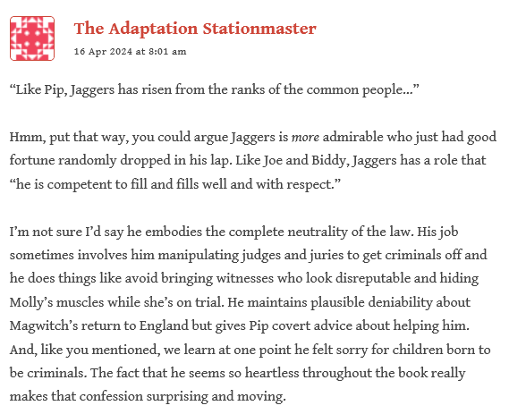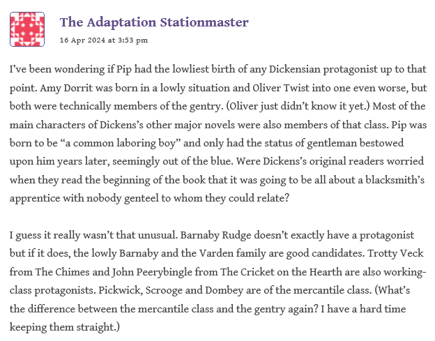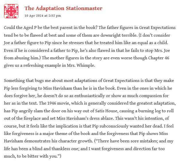 Here, the Stationmaster considers whether the “Aged P” might be the best parent in the book. He also wonders why various adaptations of this novel make Pip less forgiving towards Miss Havisham than he actually is: