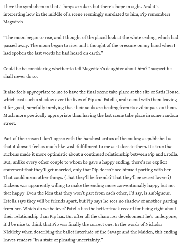 20. The Controversial Ending (The original ending, one of more melancholy but wiser bachelorhood for Pip, was altered from the original at the suggestion of Edward Bulwer-Lytton. Dickens is adept enough at making us believe it, with its note of hope, that this later version is usually the accepted/read one.)