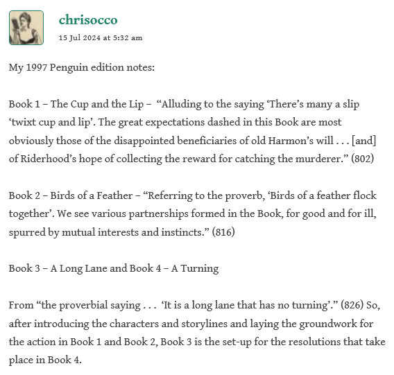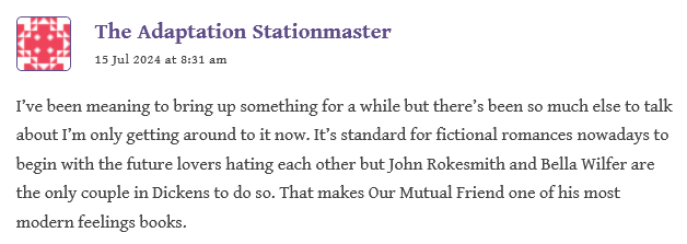 SAVE THE DATE: Based on our recent poll, we have set the Zoom chat date for Our Mutual Friend! Saturday, 17 August, 2024, 11am Pacific (US)/2pm Eastern (US)/7pm GMT (London). We’d love to have you join us! Email Rach if you aren’t on the Zoom mailing list and would like a link.