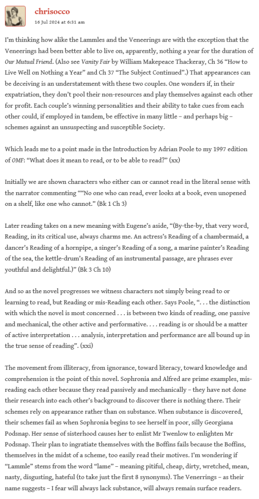 Chris’s marvelous insight about the meaning of “reading” in Our Mutual Friend, as our characters all read–or don’t read, or misread–one another and their situation: