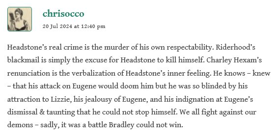 He argues that we might also see some doubling in the pursuit (of Lizzie) of Bradley, to that of Eugene: