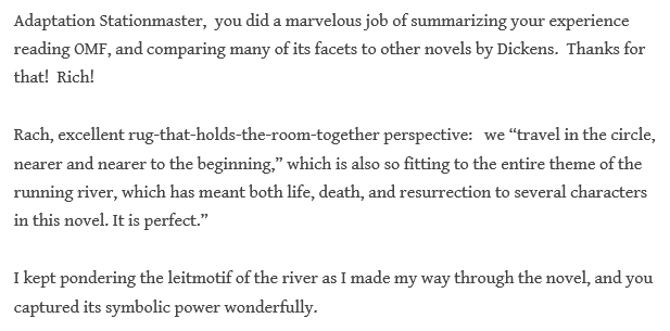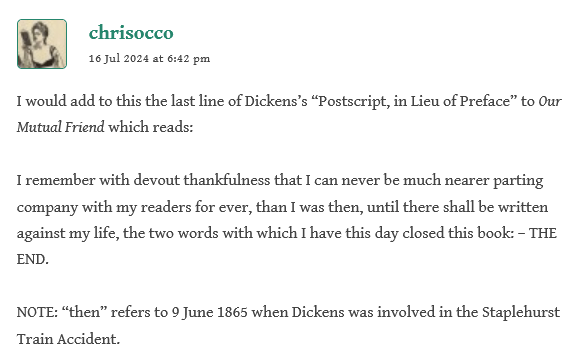 The Stationmaster gave us a wonderful listing of Dickens’s opening and closing lines, which I would love to put in a separate post, perhaps in a table format. At the end, he comments on how he feels about the closing line in Our Mutual Friend:
