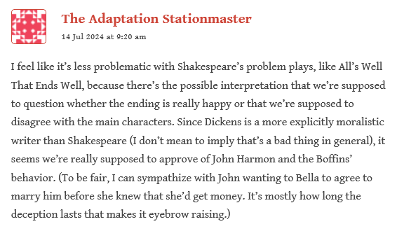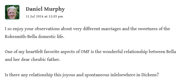 I agreed with Lucy and the Stationmaster here in my comments, feeling that the testing is a kind of Shakespearean Problem Play echoing The Taming of the Shrew; Dickens somehow pulls it off, but it remains a bit problematic because of the length of time that the testing lasts–well beyond marriage, and past the birth of Bella and John’s child.