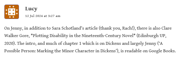 - Dickens & Disability (Dickens’s representation and positive portrayals, echoing Mr Dick in David Copperfield. Physical disability in Miss Jenny Wren; I/DD in Sloppy.)