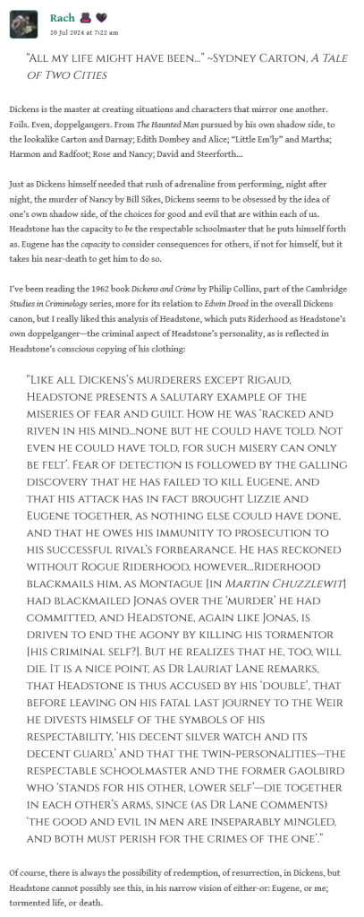 - Doubling, Foils, Dickensian Parallels (Possible doubling in the Headstone/Lizzie with Eugene/Lizzie, as referenced by Stationmaster? Also, parallels to other Dickensian novels/characters, from the Fledgeby/Riah with Casby/Pancks, to the similarities between Lavinia and the Pecksniff girls or Fanny Squeers. Headstone doubling with Riderhood as the “respectable schoolmaster” versus his criminal shadow side.)