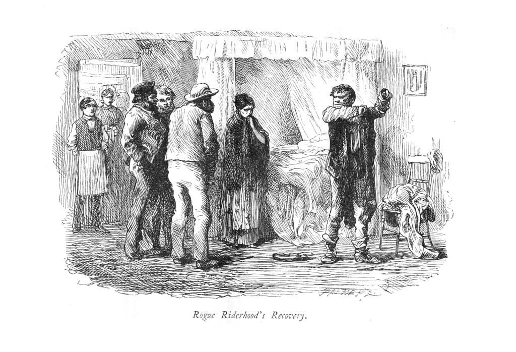 Jenny misses her friend, and she and Mr Riah visit Miss Abbey at the Six Jolly Fellowship Porters in order to clear Gaffer Hexamβs name of any involvement in Harmonβs death, with a note signed by Riderhoodβpresumably procured thanks to the secret mutual friend, Harmon/Rokesmith himself. Then, the very subject of the conversationβRogue Riderhoodβis brought in, clinically dead after having been run down by a steamer. He appears to hover between life and death, and everyone shows pity for him and even roots for him to be resuscitated.