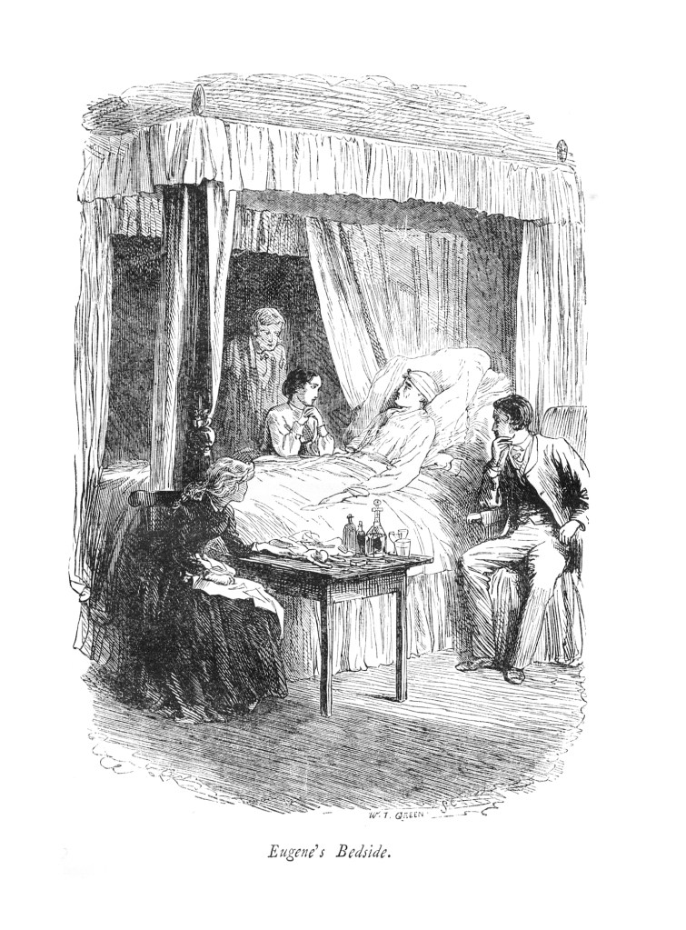 Jenny stays by him as Eugene requests first that Bradley Headstone not be pursued for his actions, as it might bring harm to Lizzie; secondly, that he wishes Lizzie to marry him. The latter, even if he dies, will preserve her reputation from harm, and perhaps help her forward. Lizzie and Eugene marry, witnessed by Mortimer, Jenny, and Bella (without John, who is still unwilling to meet Mortimer).